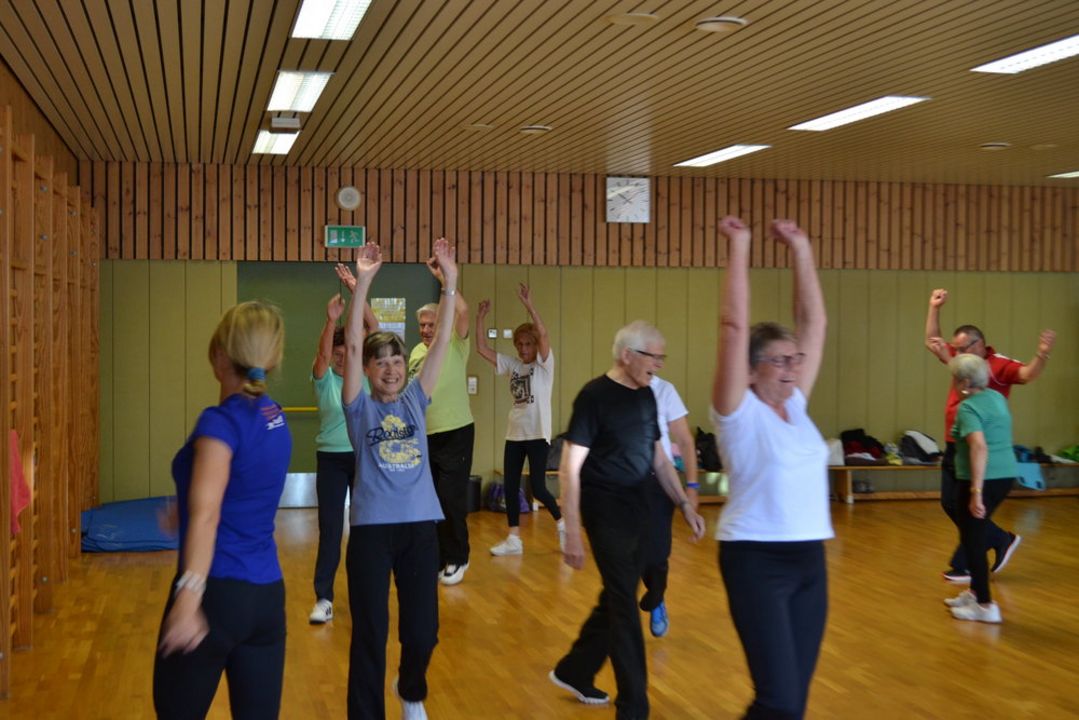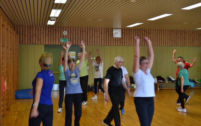 Sport bei orthopädischen Erkrankungen für Frauen und Männer in der Halle mit Elementen der Bewegungsspiele.